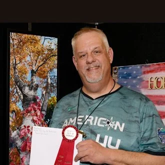 Local photographer David Schuhart proudly poses with his second place ribbon and certificate. Winners went home with awards as well as monetary prizes.