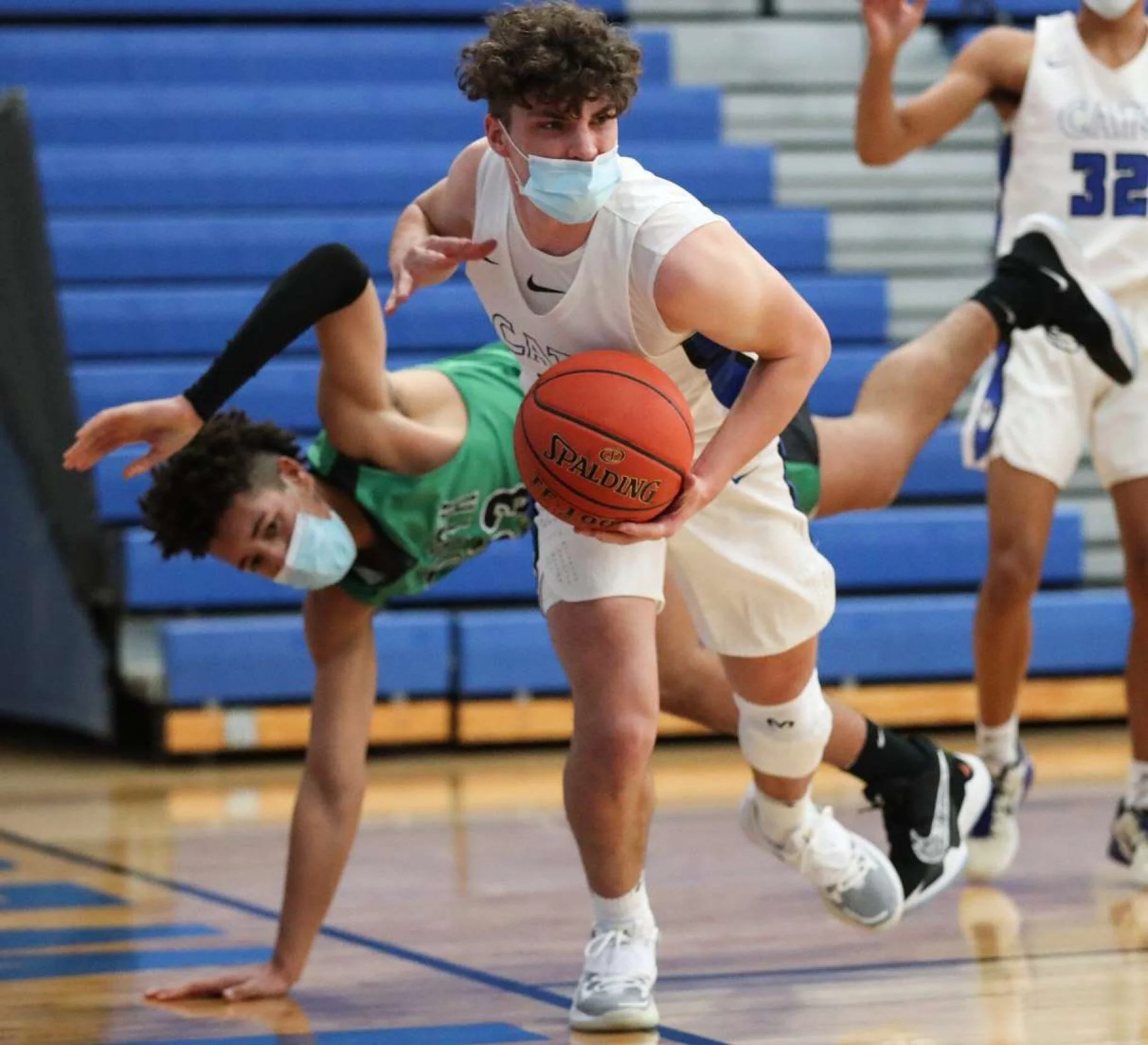 Senior Nick Pohjola tries to find a pass against Oshkosh North. The boys basketball team has started their season, but with no fans, and required masks.